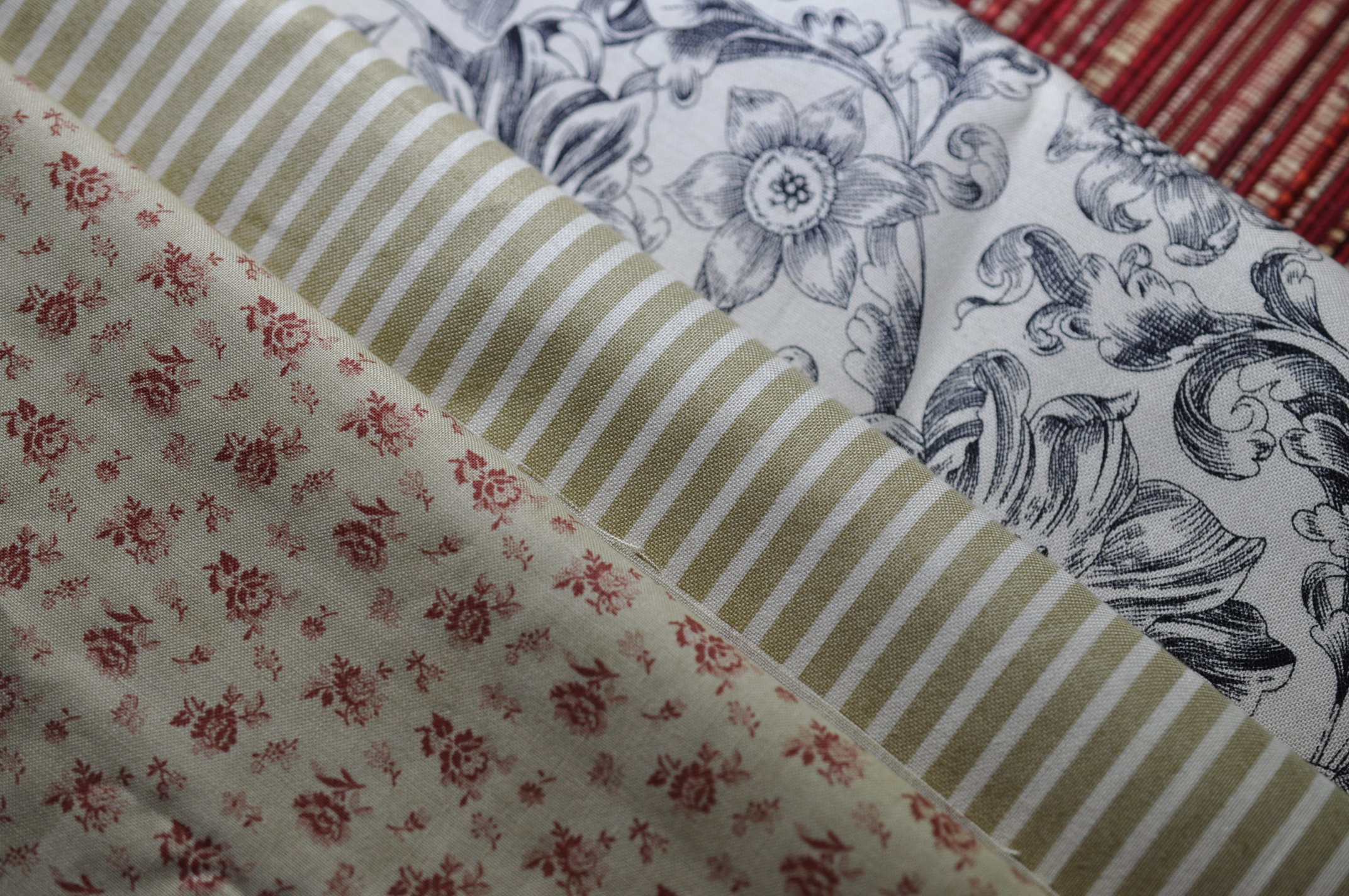 So there will be a hexagon border of the red flowers, a hexagon border of the stripe and then a solid border of the black flowers.  I was a little worried whether the pale fabrics would look too receding…then I decided to go with them anyway!